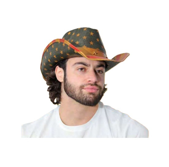 This classic antiqued weathered-look firm lacquered straw American Flag Cowboy Cowgirl Hat with Star Medallions is perfect for school events, rodeos, hoe-downs, concerts, barn parties, festivals, theme parties, cosplay, every day looks, 4th of July and other holidays, Buffalo Bills games and other sporting events, Halloween and more! The edges of the hat are turned up the fabric is designed to be still to hold its shape. Fits most adults and may fit larger teens. Other costumes and accessories (glasses, bandanas, jewelry, hair extensions, theatrical makeup, wigs, microphone props...) are sold separately on our page – subject to availability.