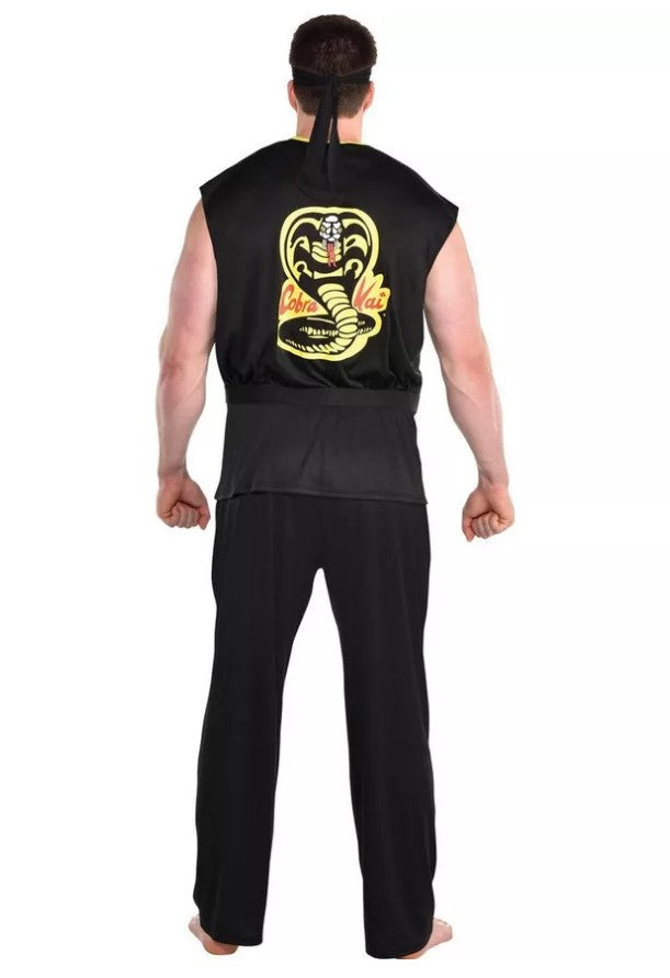 Mit diesem Kostüm sind Sie bereit, Ihren rechtmäßigen Platz an der Spitze als Johnny Lawrence oder ein anderes Mitglied der Cobra Kai einzunehmen! Dieses Kampfsportkostüm umfasst ein schwarzes Stirnband, dazu passende Hosen mit elastischem Bund, ein ärmelloses Oberteil mit V-Ausschnitt und abnehmbarem Obi-Gürtel, gelbe Details und das Cobra Kai-Logo auf Vorder- und Rückseite. Perfekt für Halloween, Geburtstagspartys, Cosplay und mehr. Erhältlich in 2 Herrengrößen: Standard (passt bis 250 lbs) oder 2XL (passt bis 270 lbs). Kostüme fallen normalerweise etwas kleiner aus als normale Konfektionsgrößen. Bitte entsprechend kaufen. Nur von Hand waschen und flach zum Trocknen hinlegen. Andere Karate- und Cobra Kai-Kostüme und Accessoires (Schwert, Nunchakus und Sais-Requisiten) für Kinder und Erwachsene werden auf unserer Seite separat verkauft – je nach Verfügbarkeit.