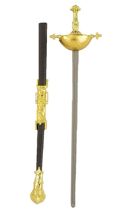 This 26.5" long saber sword with sheath (black case) and gold hilt (handle) is perfect for a costume, cosplay prop or child's toy, theatrical productions, pirates, school plays and projects, holiday events like the Nutcracker, reenactments - not meant for swordplay. Realistic-looking grey sword with shiny gold hilt in black case. You can thread your own belt or rope (not included) through the slats in the sheath to attach for wear. Made of harmless flexible plastic. One size works for adults, teens and most larger children. Other Renaissance, Medieval and historic costumes and accessories (hats, facial hair, gloves, collars, wigs, capes, cloaks, maiden accessories, theatrical makeup...) are sold separately on our page – subject to availability.