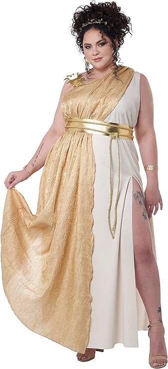 This deluxe Golden Goddess adult costume includes a dress in cream and gold trim for a charming and regal look. Make a grand entrance this Halloween with this lovely Roman Greek Goddess costume. This Golden Goddess women's toga includes a cream colored dress with one shoulder side decorated with gold fabric leaves, a gold fabric shoulder drape, a belt piece, a waist tie and a headband. Also perfect for cosplay, theatrical productions, religious celebrations, toga parties and more. Other Roman, Greek, Goddess costumes and accessories are sold separately on our page – subject to availability. Available in Women's Plus Sizes 1X or 3X. Costumes typically run a little smaller than regular clothing sizes. Please purchase accordingly. Belt piece closes in back with Velcro. Jewelry (armbands, bracelets, earrings) and shoes not included.