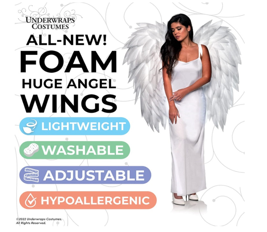 These extra long 36" lightweight white angel foam wings look like feathers. They are perfect for Halloween, Christmas, Easter, Three Kings Day, religious and biblical celebrations, theatrical productions, dress up, birds, mythical characters, cosplay and more. They slip on easily with elastic arm bands. We also carry angel halos, costumes and other accessories in multiple colors to make a great DIY, cosplay, Halloween, demon, devil, birds or theatrical costume more complete - subject to availability. One size fits most teens and adults. Shipping note: These wings will arrive in a smaller box. They will take shape after being released from the package. Steaming them will speed up this process.