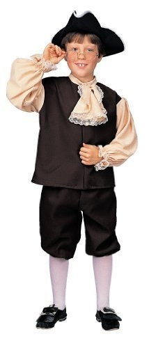 Este disfraz de niño colonial para niño de talla mediana (8-10) incluye: una camisa marrón de calidad con mangas adjuntas de color marrón claro con detalles en los puños de encaje y una jabot ribeteada de encaje adjunta, un par de pantalones a juego con cintura elástica y el sombrero del personaje. Calcetines, gafas y zapatos no incluidos. Otros trajes coloniales