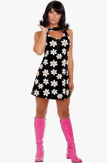 This black Flower Power 60's Daisy Mod Mini Dress Go Go disco girl costume for women includes a retro print dress. Wig, jewelry and Go Go boots not included. Other 60's and 70's costumes and accessories (Go Go boots in multiple colors, wigs, jewelry, leg wear...) are sold separately on our page – subject to availability. Comes in Women's sizes - Small, Medium or Large. Costumes typically run a little smaller than regular clothing sizes. Please purchase accordingly.