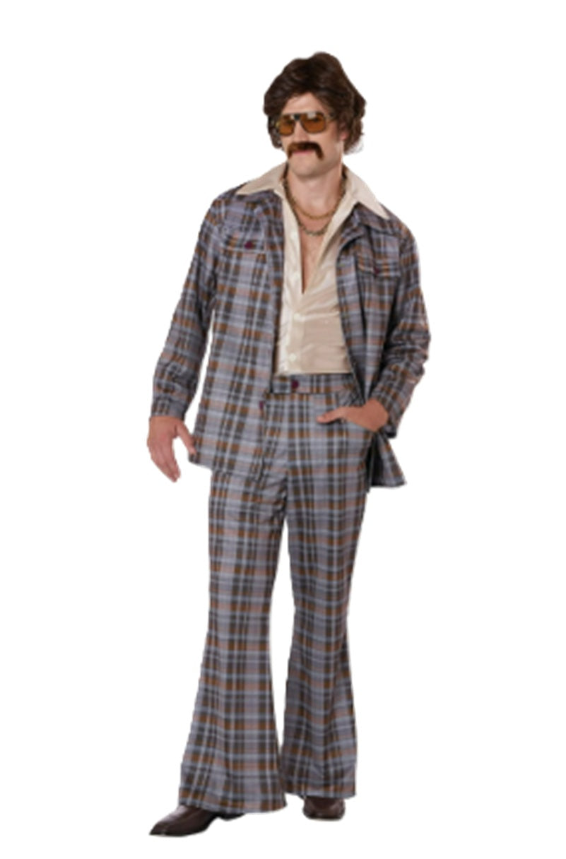 Wear your love for the '70s with this quintessential ensemble that captures the spirit of the decade. Embrace the nostalgia and make a bold fashion statement with this iconic outfit that channels retro vibes and gives you an authentic look. Plaid Stallion Leisure Suit that includes a plaid jacket, matching pants and a contrasting shirt with butterfly collar. This costume is perfect for Halloween, theme parties, fundraisers, theatrical productions and more. Available in Men's sizes Medium, Large or XL. Costumes typically run a little smaller than regular clothing sizes. Please purchase accordingly. Other disco costumes and accessories (hats, wigs, facial hair, glasses, theatrical makeup, gloves, jewelry, footwear...) are sold separately on our page – subject to availability. Hand wash or spot clean.