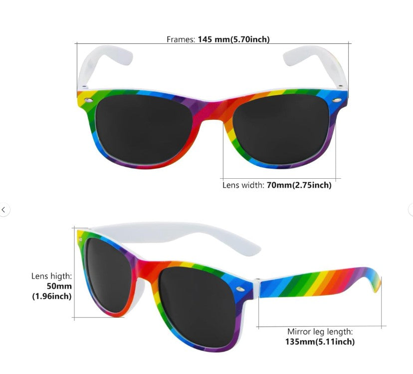 These classic 80's Blues Brothers style non-prescription sunglasses with rainbow plastic frames and dark lenses (non-polarized or designed to assist with vision needs) are perfect for theatrical productions, pride, rock stars, Halloween, hipster, nerdy, cosplay, everyday fashion, cosplay and more. Each sold individually. These glasses have sturdy and comfortable plastic frames and spring hinge temples. UV 400 lens protect against Harmful UVA, UVB Rays. Other 80's, pride costumes and accessories are sold separately on our page – subject to availability. Stripes and colors on the glasses may vary slightly.