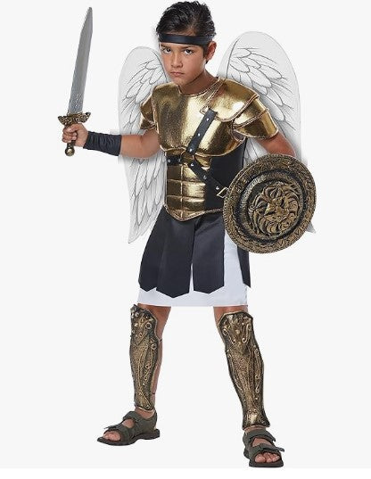 Ever vigilant from the skies above. The Archangel Child costume includes a soft-bodied top piece with front side foam armor and details, a white under shirt tunic, a pair of wings with elastic shoulder straps, a headband, a pair of wrist cuffs and a pair of shin guards. Shoes, sword and shield not included. This costume is perfect for Christmas, Easter and other religious and holiday celebrations, school plays and projects, Halloween, cosplay, theatrical productions and more. Other Angel, Biblical costumes and accessories are sold separately on our page – subject to availability. This costume is available in a Children's Small/Medium 6-10 or Large/XL 10-14. Costumes typically run a little smaller than regular clothing sizes. Please purchase accordingly.
