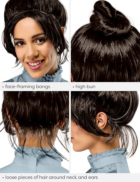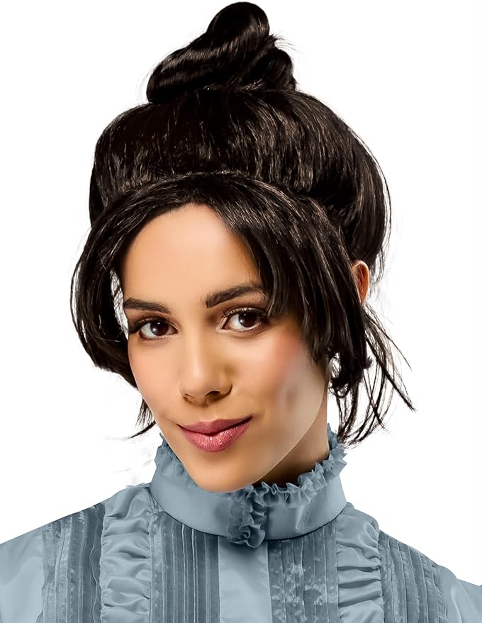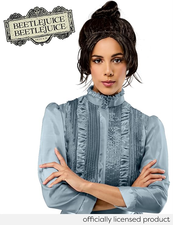 This Astrid Wig (wig only is included) is perfect for Lydia's daughter in her Victorian ghost costume look from Beetlejuice Beetlejuice. This synthetic wig is styled in a Gibson Girl Victorian style. Astrid is played by Jenna Ortega of Wednesday fame. Costume not included. Other Victorian, Beetlejuice costumes and accessories (masks, wigs, gloves, theatrical makeup...) are sold separately on our page - subject to availability. For best look, remove from the packing, shake gently and style as desired. Do not use heat. Hand wash. Air dry. One size fits most teens and adults.