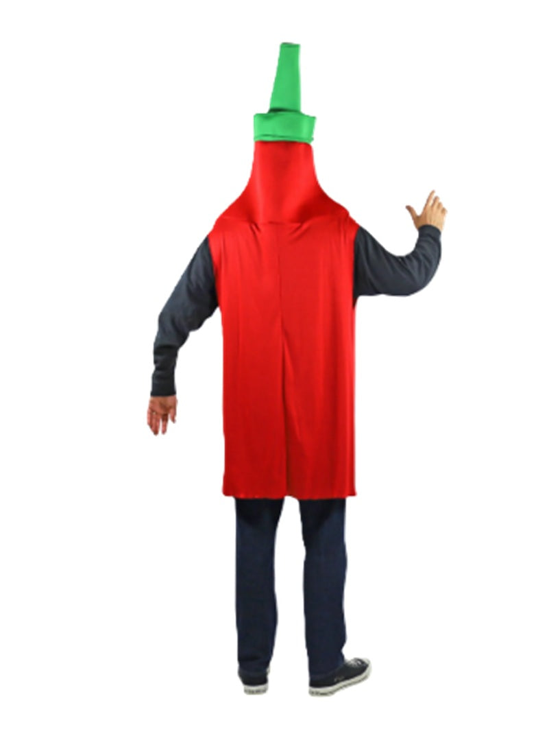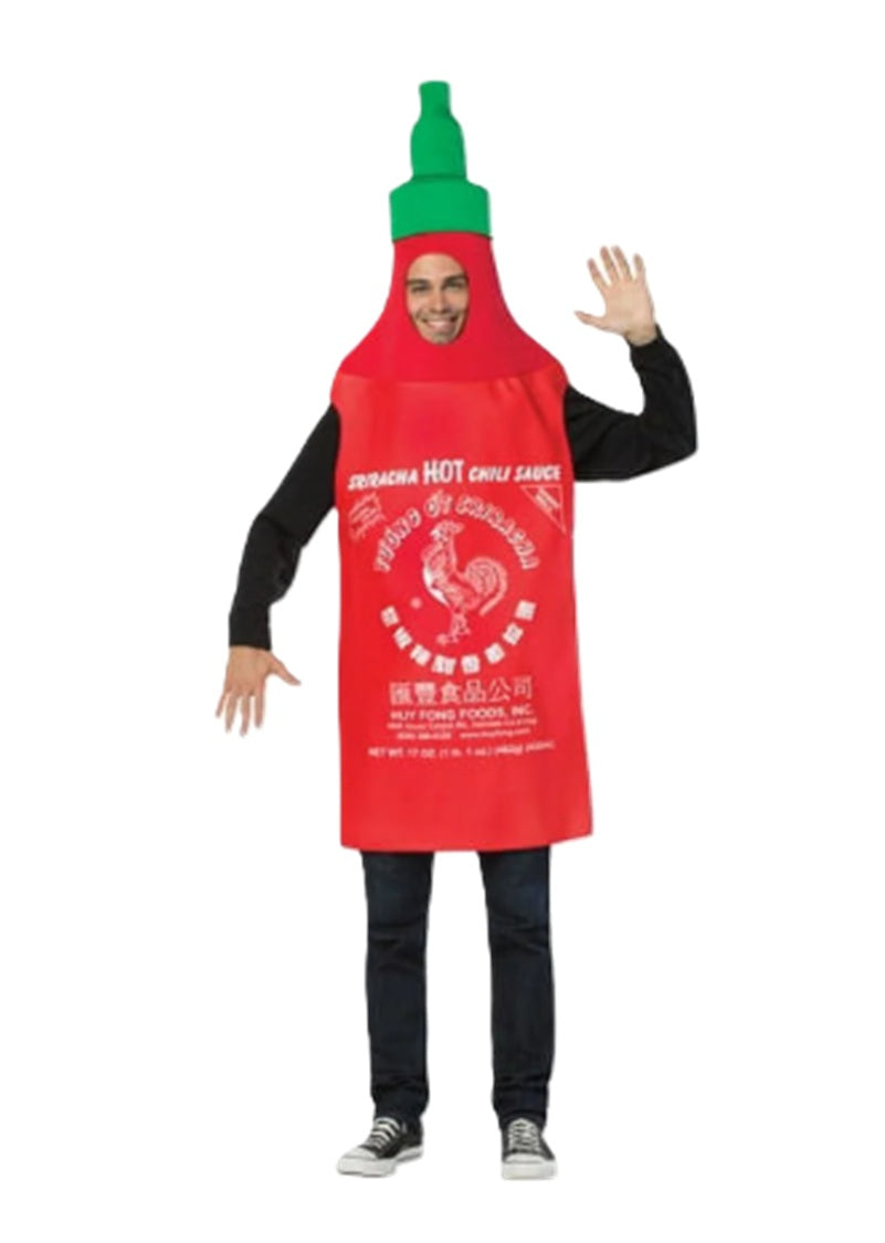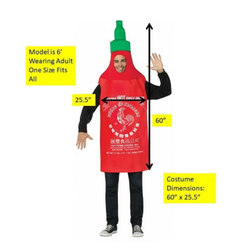 Sriracha is a Thai inspired type of hot sauce or chili sauce made from a paste of chili peppers, distilled vinegar, pickled garlic, sugar, and salt. You can spice things up on any occasion with this unisex Sriracha Hot Sauce costume tunic costume. It gives new meaning to the phrase "you are what you eat." This costume includes a red tunic printed to look like a bottle of Sriracha Hot Chili Sauce with a green nozzle hat attached to the top with an opening for your face. You can wear this over your own clothes - not included. It can be worn to greet trick or treaters, for restaurants, food trucks or business promotion, while trick or treating with your kids, to a party or other dress-up event and more. One size fits most adults. Costumes typically run a little smaller than regular clothing sizes. Please purchase accordingly. Spot clean with cold water.