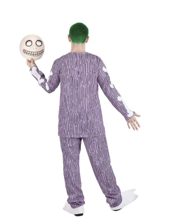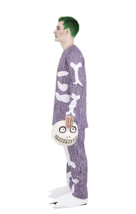 Barrel is one of the three secondary antagonists. He is part of the trick-or-treating trio with Lock and Shock, who all work for Oogie Boogie. In the original movie, he is played by Danny Elfman, but played by Jeff Bennett in Kingdom Hearts and Dee Bradley Baker in The Nightmare Before Christmas: Oogie's Revenge. We can't always say the antics of some of Disney Tim Burton's The Nightmare Before Christmas are always recommended, but we can't deny that the mischievous actions of the trio of Oogie Boogie's little henchmen do sort of fit in with the tone. Now it's time to join the fun! This deluxe, officially licensed Barrel costume brings the goofiest of the little henchmen to life thanks to a complete ensemble of outfit and accessories. You'll start with a lavender colored printed shirt featuring Barrel's skeletal disguise and a pair of elastic pants. Shoe covers give you this creepy kid’s three-toed step. The thick, foam mask with amazing features will help create his spooky fun skeletal smile. Grab all the snacks you can before Lock and Shock sneak ahead of you. Better yet, bring them along for a delightful group costume (Lock and Shock costumes not included). Perfect for Halloween, cosplay, theme parties, Christmas and so much more! Available in Men's sizes Small (37" chest, 25-36" waist), Medium (41" chest, 29-40" waist) or Large (45" chest, 33-44" waist). Costumes typically run a little smaller than regular clothing sizes. Please purchase accordingly. Other Nightmare Before Christmas costumes and accessories are sold separately on our page - subject to availability. Spot clean.