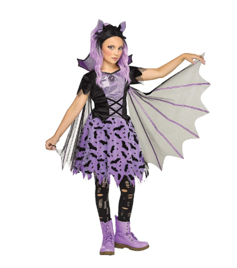 Your little one will be the cutest little bat at the party! This bewitching Batwing Beauty costume is a dress with a clever mix of fabrics including a black velvety bodice that has a shimmer purple inset in front and a matching stand-up collar. The multilayered skirt has a sheer purple bat-print top layer with a ragged hemline. Comes or Large with 2 sheer fabric wings with finger loops and a bat ear headband. Perfect for vampires, vampire bats, witches, Halloween, cosplay, theme parties and so much more! This costume comes in girls sizes Small 4-6, Medium 8-10 or Large 12-14. Costumes typically run a little smaller than regular clothing sizes. Please purchase accordingly.