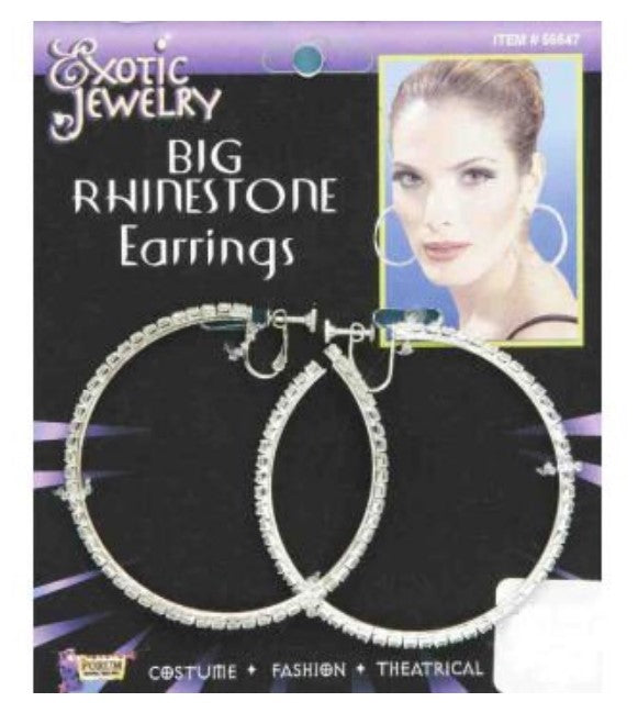 Big Hoop Rhinestone Earrings - Clip-On - Disco - 70's - Costume Accessories