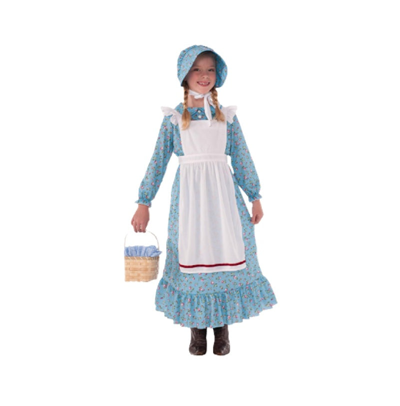 This blue calico flowered 19th century costume dress style worn by the adventurous female pioneers of the American western frontier includes a long dress with an attached pinafore apron and a bonnet hat. Shoes and flowers not included. Other pioneer, 19th century costumes and accessories (deluxe bonnets, boys pioneer costumes, gloves, leg wear, wigs...) are sold separately on our page – subject to availability. Comes in girl's sizes Medium 7-8 or Large 12-14. Costume sizes tend to fit a little smaller than clothing sizes - please purchase accordingly. This cute costume in blue calico is perfect for Halloween, school plays and projects, visits to historic villages, historical days, library events and Anne of Green Gables or Laura Ingalls Wilder, Little House on the Prairie events and more.