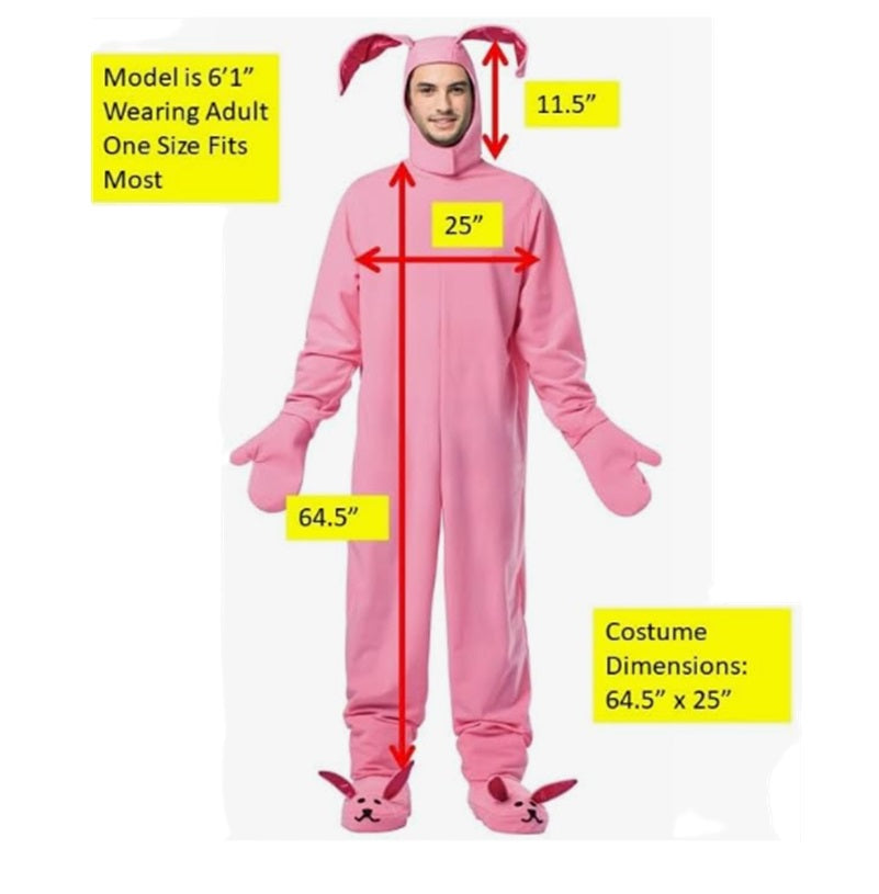Remember that 1983 classic movie A Christmas Story? Now, you can have pink pajamas just like Ralphie Parker! This comfy officially licensed costume includes a one piece pink bunny suit with a matching hood with floppy ears, mittens cute bunny face shoe covers with attached bunny ears and costume accessory glasses to help you look just like Ralphie. This is an officially licensed A Christmas Story costume. Perfect for Halloween, cosplay, theme parties, school events, Christmas celebrations, theatrical productions and so much more! One size fits most adults up to a Men's Size 42-48" Chest, 35-40" Waist. Costumes typically run a little smaller than regular clothing sizes. Please purchase accordingly. Spot clean with cold water only on a damp cloth, then air dry. Other Christmas Story and holiday costumes and accessories (Santa wig and beard sets, hats, Leg Lamps...) are sold separately on our page – subject to availability.