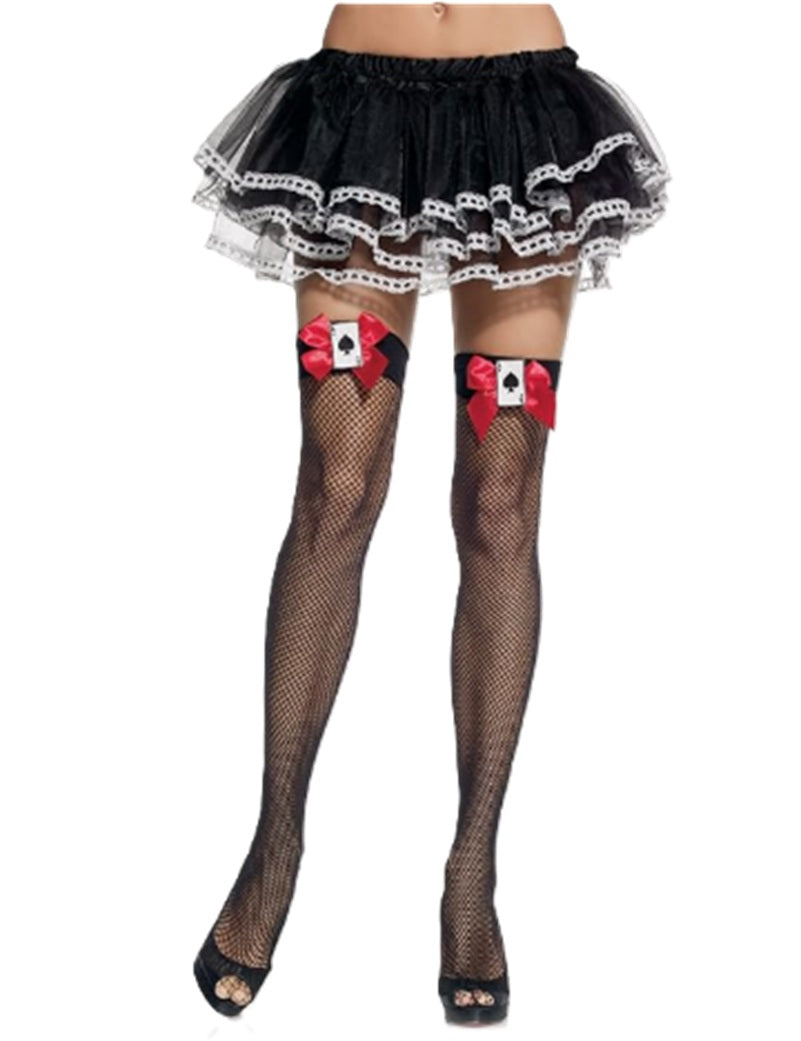 These diamond net thigh high stockings with Ace of Spades playing card applique and red satin bow. These thigh high stockings are perfect for 1920's gangsters, flappers, pimps, casino nights, cosplay, theatrical productions, Halloween, club nights and more. One size fits most 90-165 lbs. Costume accessories tend to run smaller than regular clothing sizes. Please purchase accordingly. Costume slip and shoes not included. Other costumes and accessories (slips, headpieces, jewelry, gloves, theatrical makeup, eyelashes...) are sold separately on our page – subject to availability.