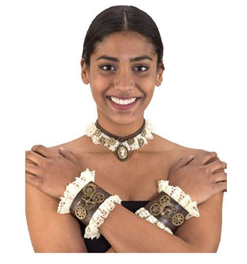 Reach back in time and lose yourself for a moment with this steampunk style choker with cameo, gears and lace and matching wrist cuffs with gears, faux clocks and lace. One size fits most adults, teens and larger children. This set is quite fashionable with it's Steampunk Victorian Industrial, Science Fiction look. Other steampunk costumes and accessories are sold separately on our page - subject to availability. One size fits most adults and teens.