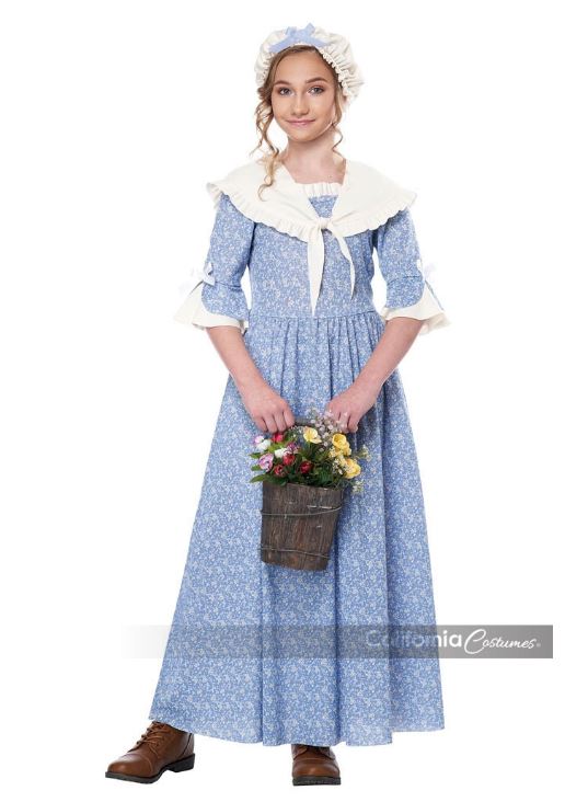 Colonists established new settlements on the North American Continent. Your little one can play her favorite colonist with this Colonial Village Girl costume. Comes with calico flower print dress, shawl with ruffle trim and cap with attached ribbon bow. Shoes and flowers not included. This cute costume is perfect for Halloween, school plays and projects, historical days and Laura Ingalls Wilde, Little House on the Prairie events. Other costumes and accessories are sold separately on our page – subject to availability. Available in 2 girl's sizes - Medium fits approximately size 8-10 or XL fits approximately size 12-14. Costumes typically run a little smaller than regular clothing sizes. Please purchase accordingly.