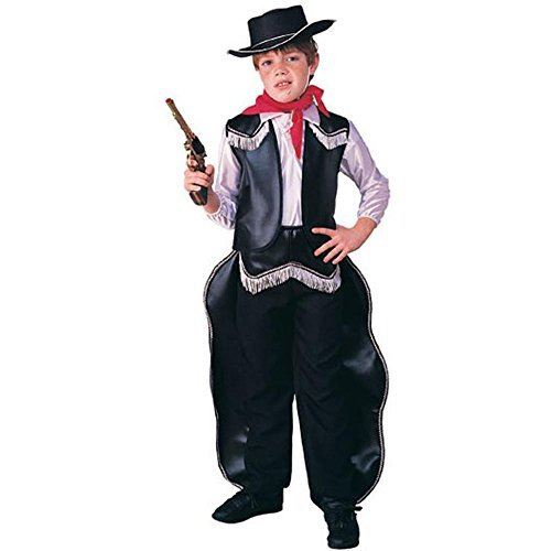 This cowboy costume includes a shirt, vest, bandana and pants with attached chaps. Available in children's size Small 4-6. Costumes typically run a little smaller than regular clothing sizes. Please purchase accordingly. Hat not included. Other cowboy western costumes and accessories (hats, spurs) are sold separately on our page – subject to availability.