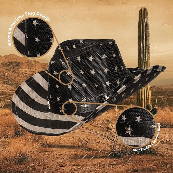 This gray and black firm lacquered straw American Flag Cowboy Cowgirl Hat with star medallions is a symbol of those who work in justice related fields like corrections officers and agents. It can also symbolize what corrupt politicians and corporations have drained from our once great nation. It is perfect for rodeos, hoe-downs, concerts, barn parties, festivals, political rallies, cosplay, every day looks, sporting events, Halloween and more! The edges of the hat are turned up. Fits most adults and may fit larger teens. Other patriotic and western costumes and accessories (bananas, holsters, weapon props, wigs...) are sold separately on our page – subject to availability.