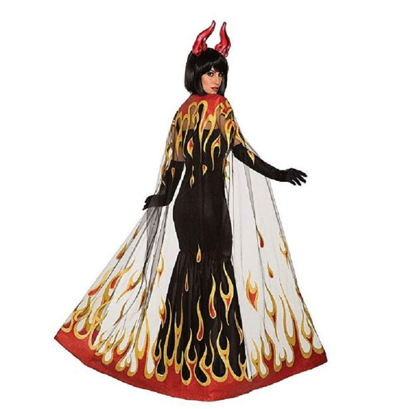 Have a hot Halloween in this oversized unisex Devil Fire Cape (cape only) for Adults! The devil has been a popular Halloween costumes for ages and you can stand out from the other devilish divas in this floor-length sheer cape. It is long and sheer black with shimmering red and yellow flames coming down from the shoulders and up from the floor. When you wear this breathtaking cape, even angels will be tempted to follow you to Hell! Costume dress and horns not included. Other devil and demon costume accessories (horns, tail, props, theatrical makeup...) sold separately on our page – subject to availability. One size fits most adults (unisex). It fits larger as it is designed to fit over clothing and other costumes.