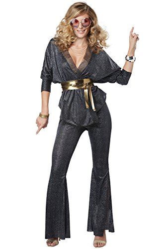 This stylish and comfortable disco dazzler costume includes a wrap around top with mesh trim and matching elastic waist bell bottom pants in a black and silver glitter fabric (wearing undergarments or shapers is recommended as the glitter can be a little rough on the skin) as well as a gold wrap belt with Velcro closure. Available in Women's sizes XS 4-6, Small 6-8, Medium 8-10, Large 10-12 or XL 12-14. Plus sizes also available under a separate listing. Other disco costumes and accessories (foot wear, glasses, theatrical makeup, hair extensions, headpieces, jewelry, wigs...) are sold separately on our page – subject to availability. Slight color variations in computer monitors, mobile devices and tablets may exist.