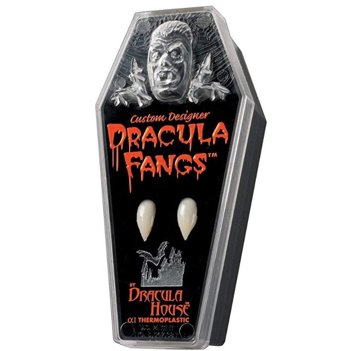 The Original! Custom Designer(R)Dracula Fangs(R)are loved by, party-goers and actors worldwide because of their natural look and secure fit that enables them to talk easily and naturally, as well as drink cold beverages! Custom Designer Fangs can be worn many times without refills or adhesives. Each set includes a package of non-toxic Alpha One(TM) Thermoplastic and complete instructions to create a custom fit. The packaging also has a scan-able QR code for access to a demonstration video for perfect fitting techniques. Natural tooth color and superior product quality and finish make these the finest fangs available! Comes in coffin packaging. Other costumes and accessories (wigs, theatrical makeup, gloves, jewelry, bow ties, capes...) are sold separately on our page – subject to availability.