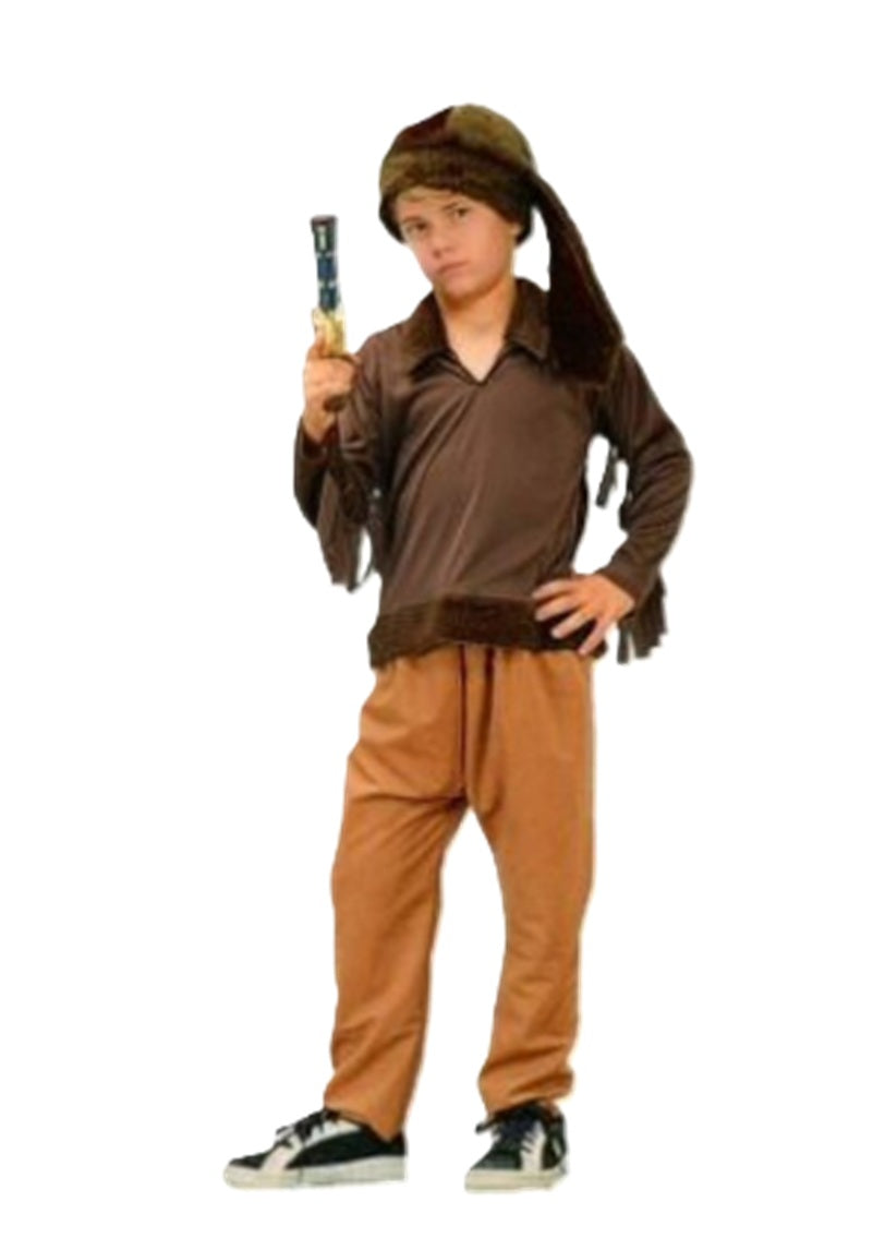 This frontier boy costume is a perfect for frontier and pioneer days, Davey Crocket, Daniel Boone, innovative play, school plays and projects and more. This pioneer costume comes with a soft polyester brown shirt, tan pants with elastic waist and a faux fur racoon style hat. Available in boys' sizes Small 4-6. Costumes typically run a little smaller than regular clothing sizes. Please purchase accordingly. The weapon prop and footwear are not included. Other pioneer, frontier costumes and accessories (weapon props) are sold separately on our page – subject to availability.