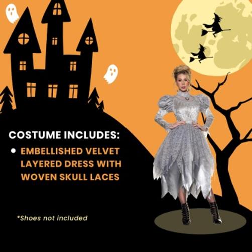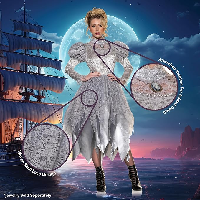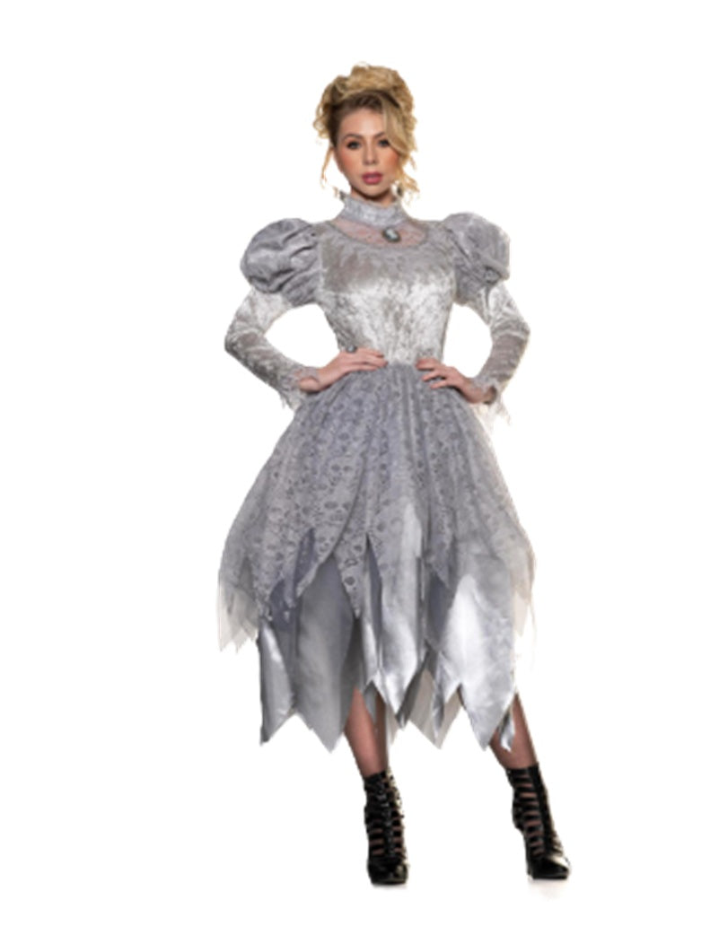 This beautiful, gray Victorian inspired ghostly spirit velvety layered tea length dress has skull patterned lace and is embellished with jagged lace wrist cuffs and a cameo. Other props and accessories are sold separately. Other ghost costumes and accessories (gloves, canes, hats, theatrical makeup, wigs....) are sold separately on our page – subject to availability. Footwear not included. Perfect for a Harry Potter house ghosts, cosplay, theatrical productions, dress up, theme parties and more. Comes in women's sizes Small 4-6,  Medium 8-10 or Large 12-14. Costumes typically run a little smaller than regular clothing sizes. Please purchase accordingly. This item's color may vary due to inherent manufacturing variations or your computer monitor's color settings.