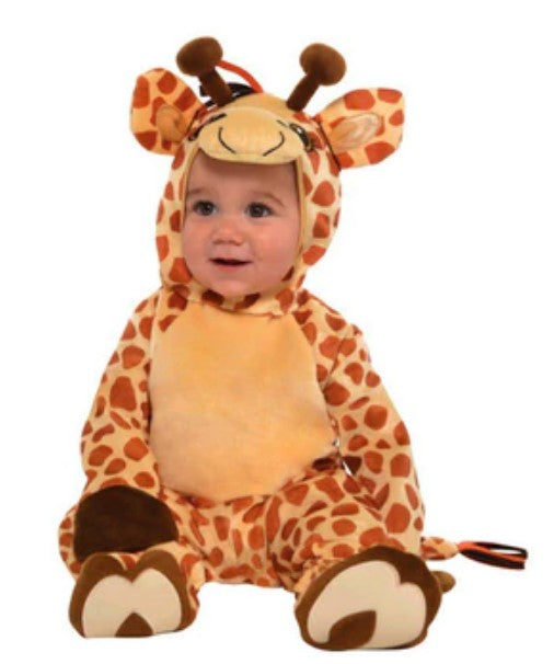 Your little one will be the cuddliest one around when they wear this junior giraffe infant costume. This adorable costume includes a fuzzy brown spotted jumpsuit, a matching hood with cute giraffe ears and horn detailing and matching booties. While your little one is wearing this costume you'll never want to let them go! Perfect for Halloween, costume parties, pageants, day care events, family parties, dress-up and more! Available in infant size 18-24 Months. Costumes typically run a little smaller than regular clothing sizes. Please purchase accordingly.