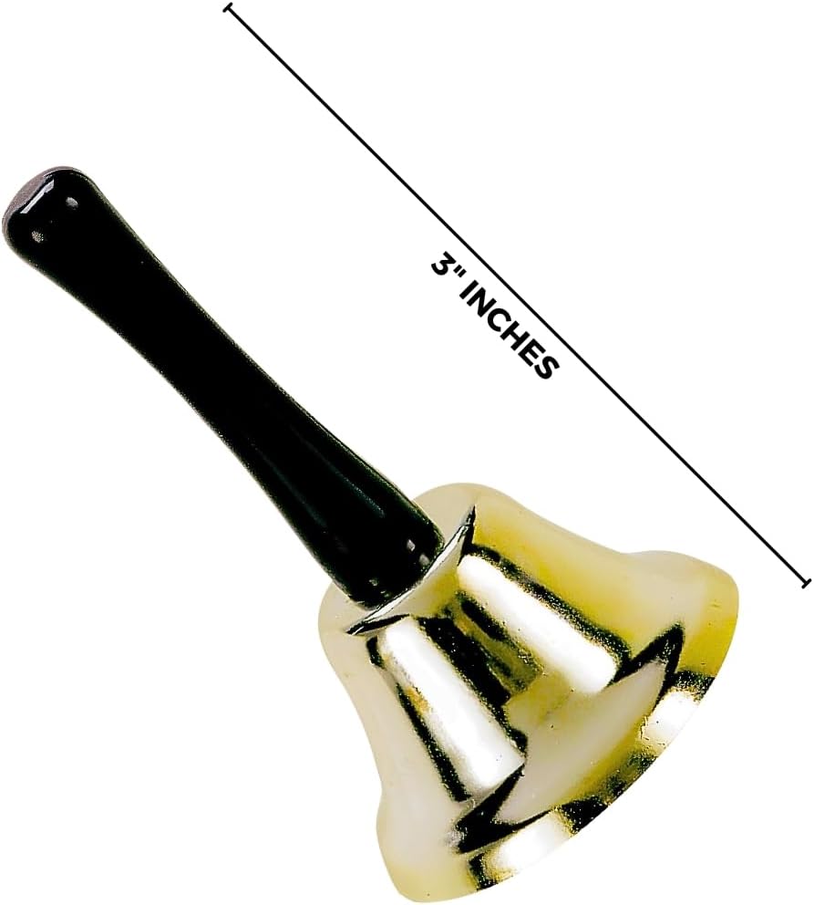 This golden colored metal bell is 3" in diameter with brown handle. Perfect for maids and waiters, Santa visits, Town Cryer, cosplay, holiday festivals and parades, theatrical productions, bell ringers for holiday fundraisers and more. Other Santa and Christmas costumes and accessories (wig and beard set, gloves, hat, belt, boots...) are sold separately on our page – subject to availability.