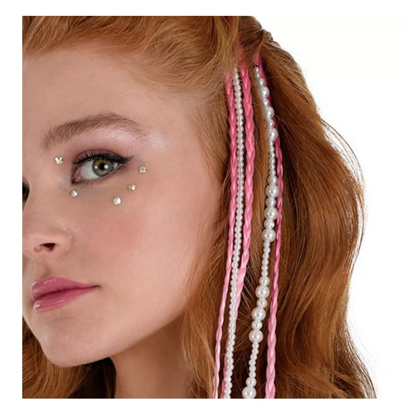 You will be so pretty in pink with these clip-in 21" long braided hair extensions and faux pearls. They are perfect for many costume looks in the 80's, 90's, good witches, pop stars, Wizard of Oz or Wicked, starlets, fairies, butterflies, cheer, dance, theatrical productions, everyday wear and more. Comes in shades of pink and white with faux pearl beads. These hair extensions come with easy-to-attach clips that securely fit onto your hair, giving you a seamless and worry-free hair transformation experience. Costume, gloves, face jewels and theatrical makeup not included. Other costumes and accessories (face jewels, gloves, theatrical makeup, wigs, leg wear, hats, brooms...) are sold separately on our page – subject to availability. Fits most adults and may fit teens and larger children.