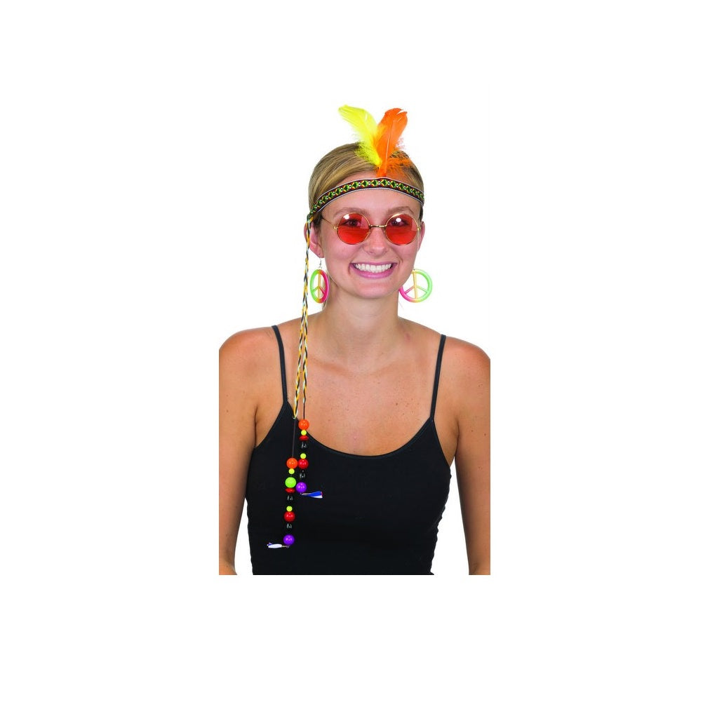 You can have a far out time for Halloween, cosplay, theme parties, theatrical productions and so much more! This hippie set includes glasses, hook earrings and a groovy headband with beads and feathers. It fits most teens and adults. Other 1960's and 1970's costumes and accessories (jewelry, wigs, theatrical makeup, leg wear, hair extensions and braids...) are sold separately on our page - subject to availability.