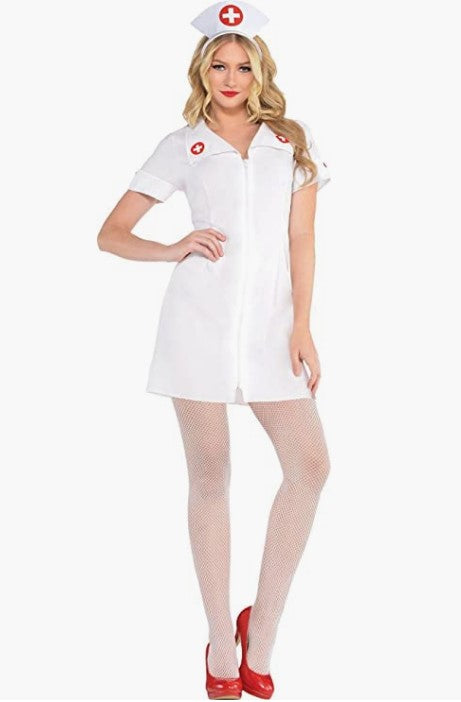 This flirty nurse costume includes a white zipper front V-neck top and flattering slightly flared skirt for a sexy hourglass look as well as a nurse cap headband. Perfect for Halloween, cosplay, theme parties, theatrical productions and more. Available in Adult Sizes Small 2-4 or Medium 6-8. Costumes typically run a little smaller than regular clothing sizes. Please purchase accordingly. Other medical inspired costumes and accessories (stethoscope props, medical bag purse, gloves, masks, scrub costumes...) are sold separately on our page – subject to availability. Shoes and tights not included.