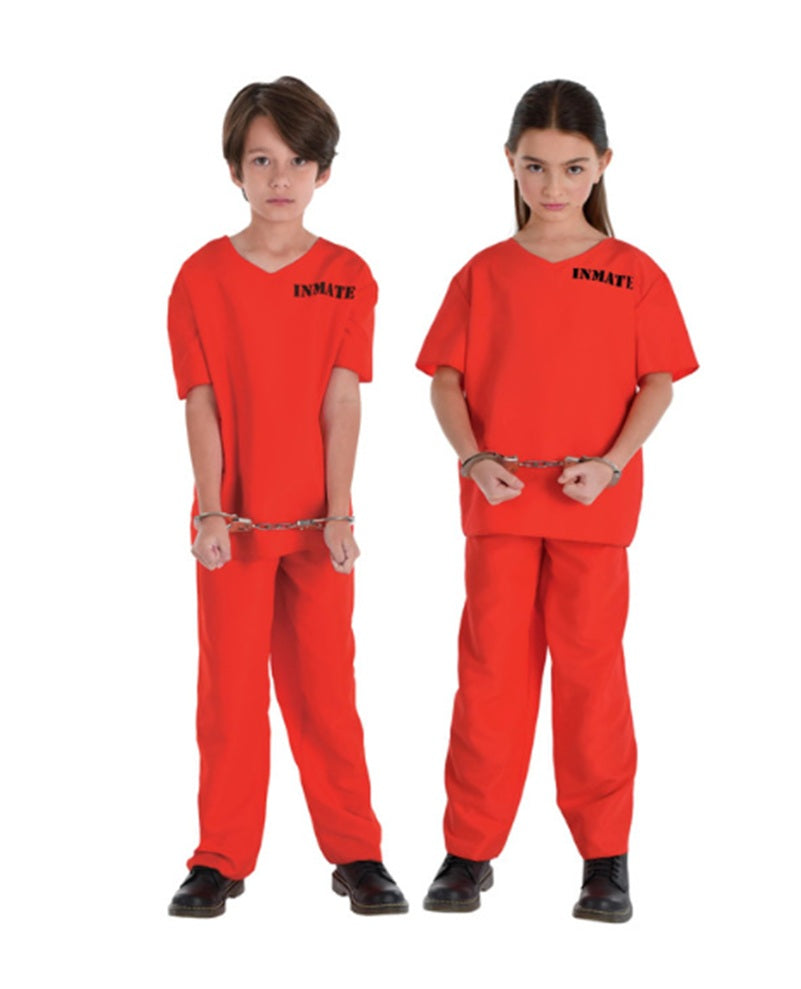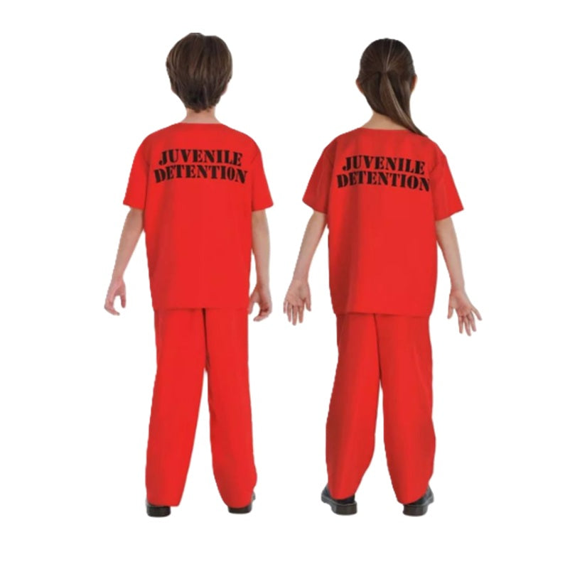 This unisex incarcerated convict jumpsuit with "Inmate" screen printed on the front and "Juvenile Detention" on the back is perfect for theme parties, Halloween, cosplay, TV and movie characters, group costumes and more! Available in children's sizes (boys) Small 4-6, Medium 8-10, Large 12-14 or XL 14-16. Costumes typically run a little smaller than regular clothing sizes. Please purchase accordingly. Hand wash, line dry. Other convict, inmate costumes and accessories are sold separately on our page – subject to availability.