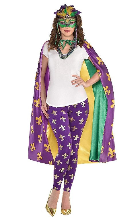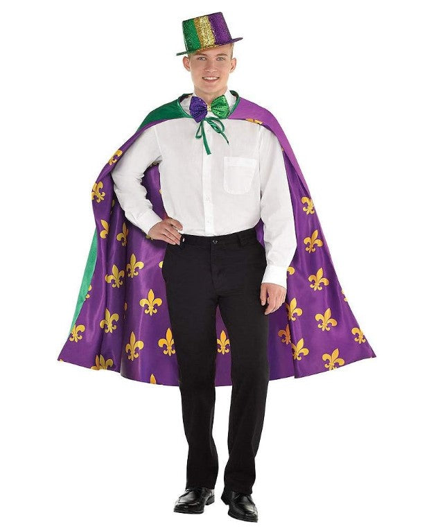 This unisex Mardi Gras cape features a gold, purple, and green Mardi Gras color with a Fleur de Lis symbol print design on one side and the colors of Mardi Gras on the other. Only the cape is included. Shoes, accessories and clothing do not come with it. Also great for Saints games - Who Dat? Other Mardi Gras costumes and accessories (masks, beads, scepter, glasses, theatrical makeup, staffs, hats, wigs...) are sold separately on our page – subject to availability. One size fits most adults.