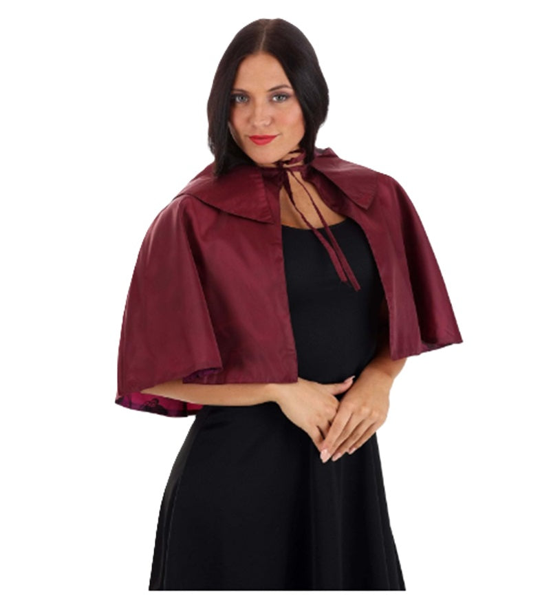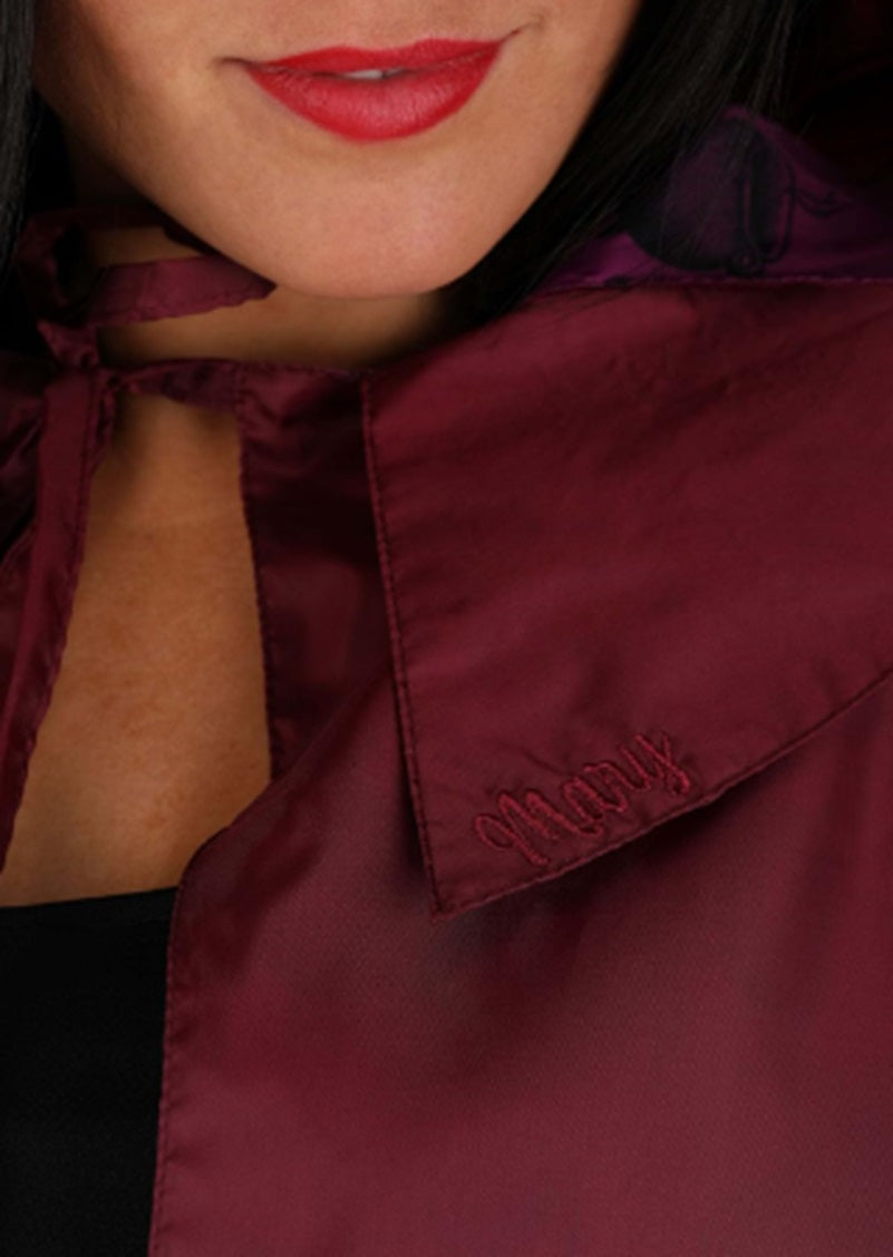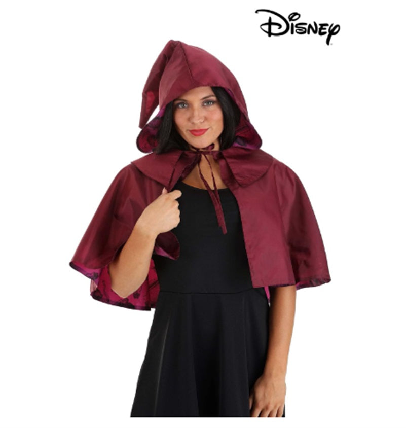 It has been three hundred years, but finally a virgin has lit the black flame candle! You and your sisters tumble back into the world of the living, ready to track a delicious child down by its scent and terrorize Salem once more. Things have changed since the 17th Century - they sell chocolate-covered fingers of men named Clark, for instance - but the changes won't stop your nefarious plans! Oh no, has October sneaked up on you once more? If you haven't figured out your costume yet, don't panic. Once you're finished with your calming circle, put on this fun officially licensed capelet and voila! You're a spellbinding witch who's ready to take her vacuum out for a night on the town! This maroon nylon hooded capelet has ties to secure it around neck and purple nylon lining with Hocus Pocus graphics. Mary's name is embroidered on the collar. One size fits most teens and adults. Costume and vacuum cleaner are not included. Other Hocus Pocus and witch costumes and accessories (Mary's wig, hats, theatrical makeup...) are sold separately on our page – subject to availability. Hand Wash. Air Dry.