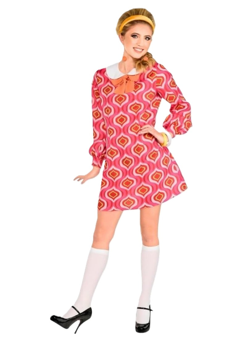 This Mod Mini dress costume for women includes a pink geo psychedelic print dress with attached bow. Jewelry, hair band, socks and shoes not included. Other 60's and 70's costumes and accessories (socks, footwear, jewelry, glasses, wigs...) are sold separately on our page – subject to availability. Comes in Women's Size Standard (One Size - up to size 12). Costumes typically run a little smaller than regular clothing sizes. Please purchase accordingly.