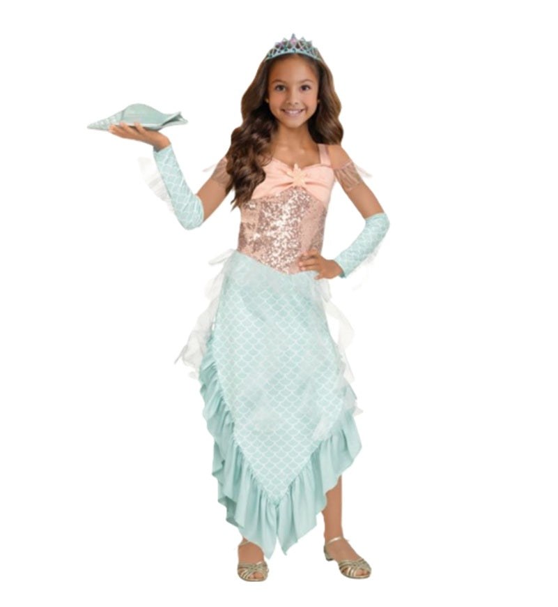 Transform your little one into a shimmering sea enchantress with our Magical Mermaid Costume. This enchanting outfit includes a stunning gown, charming sleevelets and a sparkling tiara with an elastic band. This costume is eye-catching and has a comfortable fit that she will love. Also great for cosplay, Halloween, fairies, royalty, theme parties and other special events. Available in girls sizes Medium 8-10, Large 12-14 or XL 14-16. Costumes typically run a little smaller than regular clothing sizes. Please purchase accordingly. Shoes and shell are not included. Other costumes and accessories (tridents, theatrical makeup, wigs, face jewels...) are sold separately on our page – subject to availability.