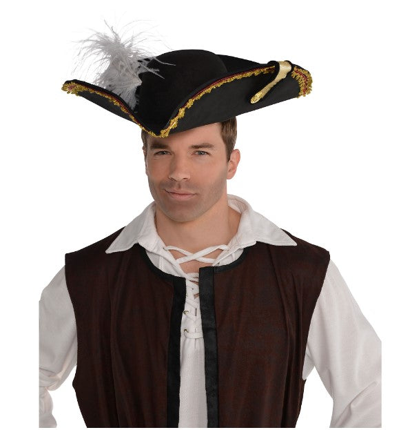 This deluxe black faux suede (polyester) buccaneer tricorn hat with gold and burgundy ribbon trim and a white feather is approximately 18" in diameter and 4" tall. It is perfect for Colonial, American Revolution, Minutemen, Pirates and more. Fits best on adults and larger teens. Other pirate colonial costumes and accessories are sold separately on our page – subject to availability.