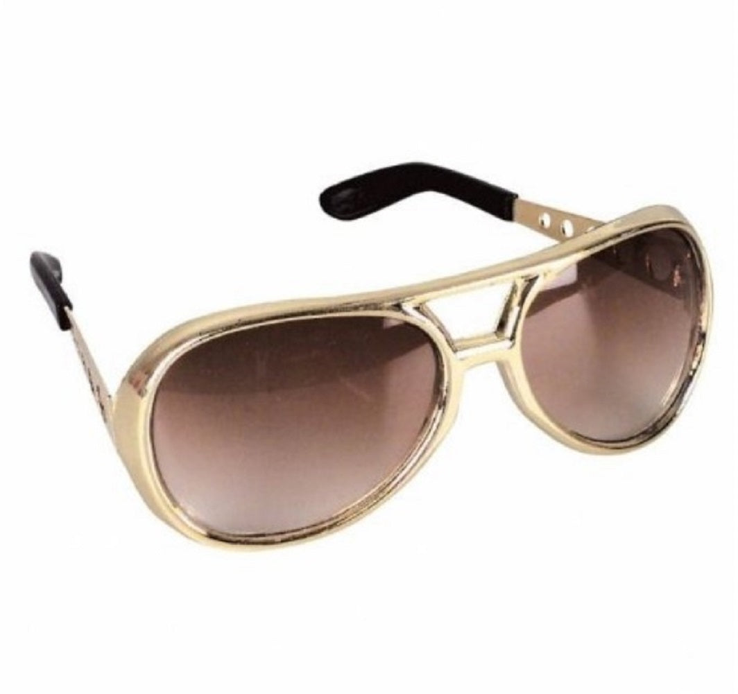 Be the King of Rock with Elvis Sunglasses! These plastic economy style Elvis sunglasses are a great way to complete your Elvis Halloween costume. These glasses measure approximately 5" across the face and have gold plastic frames with dark lenses. Other costumes and accessories (wigs, facial hair, shoes, scarves, microphones...) are sold separately on our page – subject to availability. These Elvis sunglasses are the perfect addition to any Elvis, aviator, rock star costume. These stylish Elvis sunglasses are also great for pimp costumes and poker nights no matter what your event, make sure you have the Elvis sunglasses you need! Not for vision correction. One size fits most teens and adults.