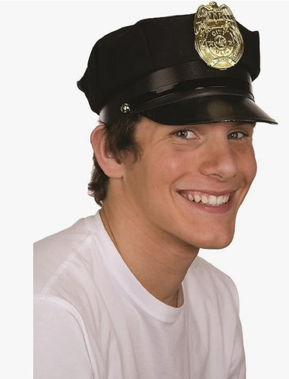 This adjustable police hat in navy blue with black vinyl brim and plastic gold badge is the perfect costume accessory for nearly all sizes - older children, teen or adult. This hat is perfect for Halloween, dress up, theme parties, school projects, gags and more! Other police costumes and accessories (wigs, sunglasses, theatrical makeup, gloves, badges, nightstick props, handcuffs...) are sold separately on our page – subject to availability. Recommended for costume accessory use only. Slight color variations in computer monitors, mobile devices and tablets may exist.