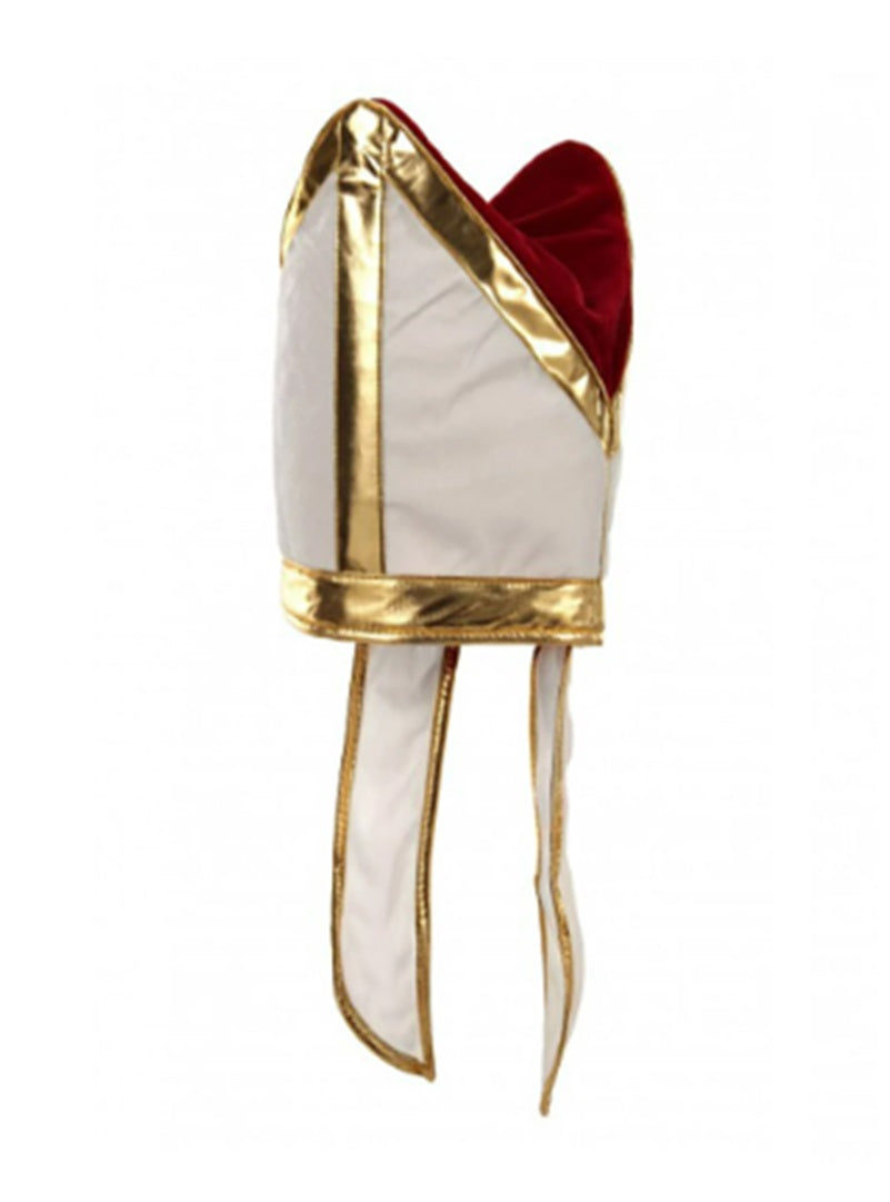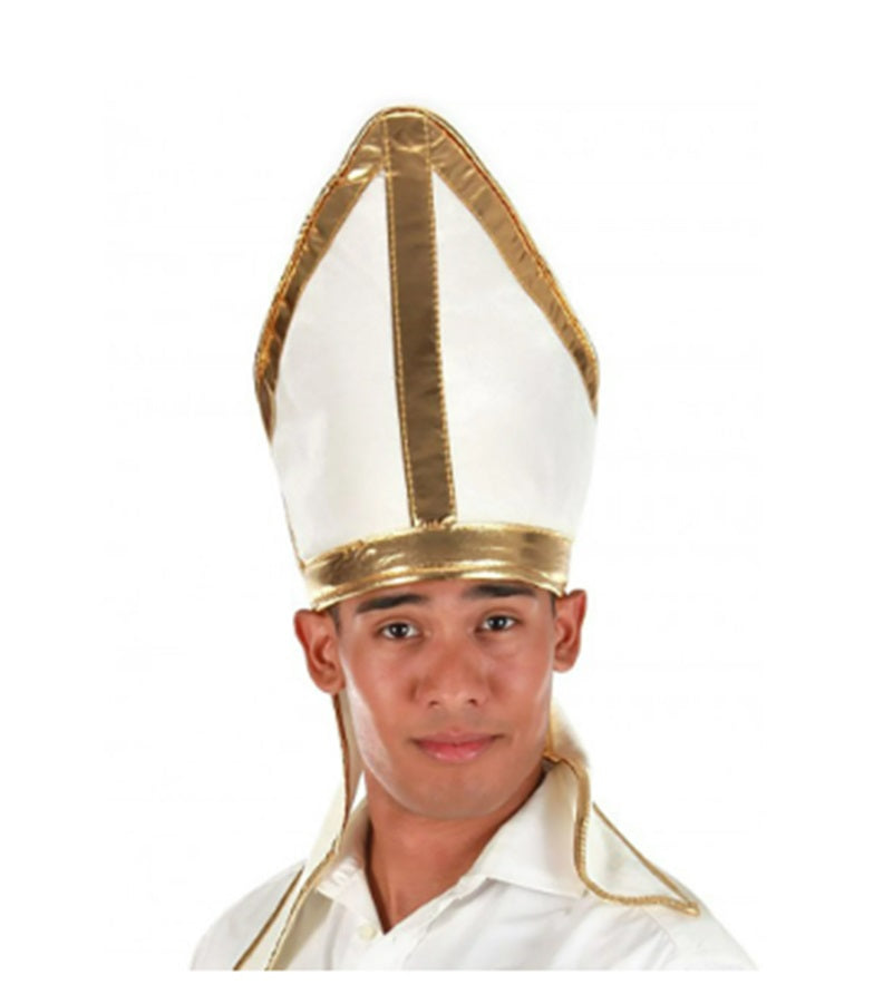When it comes to electing leaders, no one does it as spectacularly as the Catholics. When a pope is no longer in the Vatican, all the cardinals get together in a super-secret group to decide who will be chosen to lead the Catholic church. If the cardinals vote and don't come to a consensus, they'll burn the ballots and send black smoke through a special chimney to let Vatican City know that the decision is still up in the air. If the 115 cardinals agree on a leader, they'll send out white smoke to let the good news be known. You might not have been voted into a leadership position by 115 holy men but you can still dress just like the pope with this papal mitre hat! This tall pure white hat is trimmed with a brilliant gold fabric. A veil hangs behind the crown for an extra dramatic take. The interior of the hat has a size adjuster to make sure it fits a range of head sizes. Whatever you wear this hat with, you're sure to be a blessing to any occasion you arrive at! The costume is not included. This mitre also looks great for St. Nicholas at Christmas time. Other religious costumes and accessories (cross necklaces, staffs...) are sold separately on our page – subject to availability.