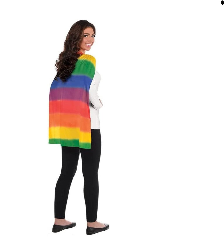 Showcase your Pride or be your favorite superhero with our short 30" Rainbow Cape! This fun rainbow striped accessory is unisex and perfect for Halloween, sporting events, theatrical productions, Pride parades and more. One size fits most adults, teens and larger children (will look longer on shorter individuals). Other costumes and accessories (hats, wigs, glasses, headpieces, flags, gloves, theatrical makeup, jewelry, leg wear...) are sold separately on our page – subject to availability.