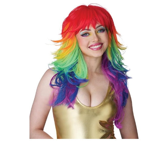 This rainbow face framing fringe wig is perfect for all your cosplay and costumes from unicorns and ponies to punks and rock stars, disco and even pride festivities. One size fits most adults and teens. Costume, jewelry and theatrical makeup not included. Other unicorn, pride and rock star costumes and accessories (hats, wigs, eyelashes, masks, glasses, theatrical makeup, gloves, jewelry, leg wear...) are sold separately on our page – subject to availability.