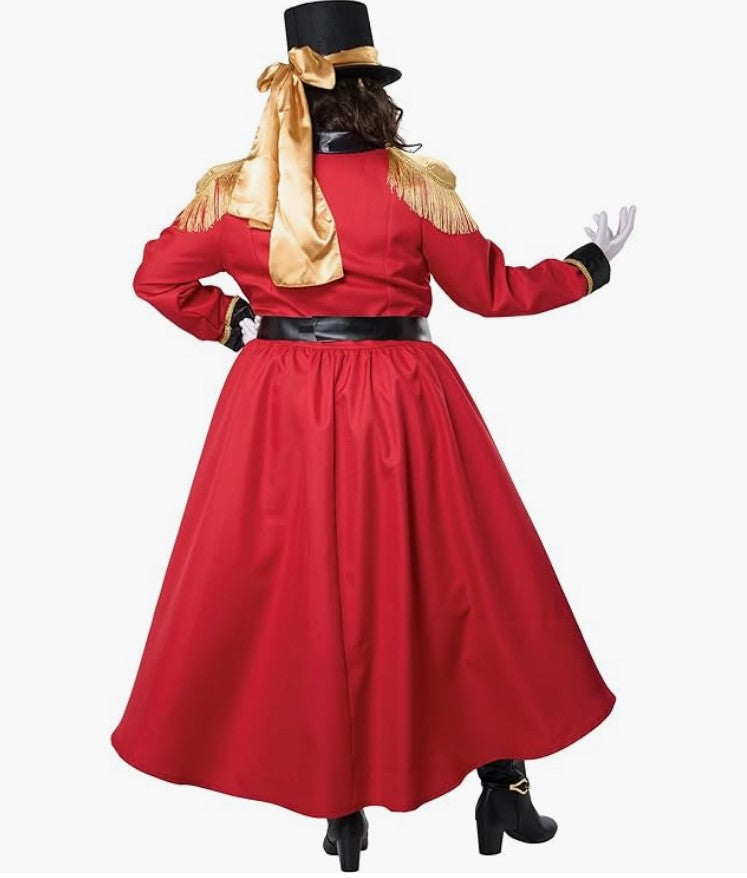 Call in the clowns and ring in the perfect costume with our Ravishing Ringmaster Women's Circus Costume and have the perfect look for any circus-themed event! With this costume, you can easily command attention and become the center of the show. This costume features a bold red and black color scheme with gold accents and features a striking long lightweight red coat with black lapels and gold detailing, a short fitted black and white striped dress, a belt with a buckle and a collapsible three-piece hat and a gold hat band. The long flowy jacket adds a touch of drama and elegance to the costume, making it stand out from other circus-themed costumes. Fishnet stockings, choker, gloves, whip and boots not included. Whether you're performing as the ringmaster of your own circus or simply enjoying a night out with friends, this costume is sure to make you feel powerful and in control, while also being fun and playful. Available in Women's Plus Sizes - 1X or 3X. Other circus costumes and accessories (leg wear, hats, chokers, gloves, whips...) are sold separately on our page – subject to availability.