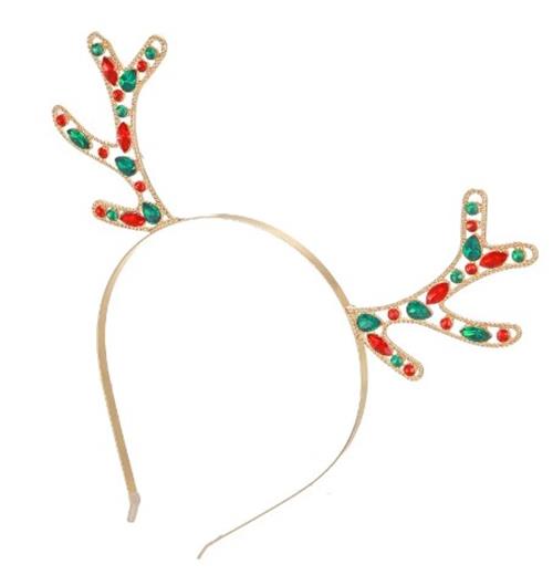 This metal gold look headband with reindeer antlers made of green and red rhinestones is perfect for Christmas, holiday celebrations, selfie stations, Christmas in July, festivals, photo booths, school, corporate and family events and more. Sized to fit most larger children, teens & adults. Other reindeer and Christmas costumes and accessories (Santa wig and beard sets, hats, Mrs. Claus and elf accessories, glasses, belly stuffers, theatrical makeup, gloves, bags, bells...) are sold separately on our page – subject to availability.