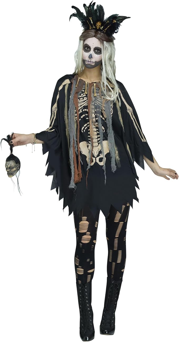 With a poncho, your arms are always free for any Halloween fun! This poncho is also very lightweight to make your party more comfortable. Includes a black and bone colored skeleton poncho with jagged and torn fabric accents. One size fits approximately size 4 to 14. Perfect for voodoo looks, Mardi Gras, skeletons, school plays, theatrical productions, Halloween, parades, festivals and more. Mask and theatrical makeup not included. Combine with your own pants, stockings, leggings, boots or other clothing. Voodoo, Skeleton, Mardi Gras and other costumes and accessories (masks, theatrical makeup, staffs, headpieces, props...) are sold separately on our page – subject to availability.