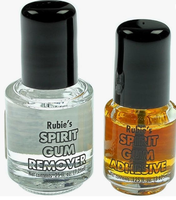 Spirit gum is a skin adhesive that attaches beards, ears, crepe hair, prosthetics, latex appliances or other pieces to the skin. Dab remover with a cotton ball or swab as you peel back the appliance then wash the skin with soap and water. Be careful around your eyes. Includes one bottle of spirit gum adhesive (.25 oz) and one bottle of adhesive remover (.125 oz). Easily add and remove fake scars, horns or prosthetics with this Hollywood quality spirit gum set. A wide variety of latex wounds, noses, chins, appliances and other prosthetics are available separately on our page -- subject to availability. Made in the USA.