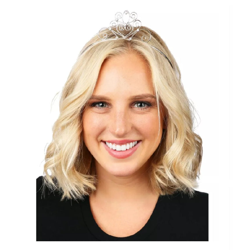 This lightweight, fun rhinestone tiara is made of faux clear jewels and silver look metal and is perfect for prom, theatrical productions, Quinceañera, homecoming queen, fairies, queens, princesses, weddings and more. The arms of the tiara have combs on them to help it stay in the hair better. Other "royal" costumes and accessories (gloves, theatrical makeup, scepters, wigs, hair extensions, face jewels, eye lashes, wands...) are sold separately on our page – subject to availability. One size fits most larger children, teens and adults.