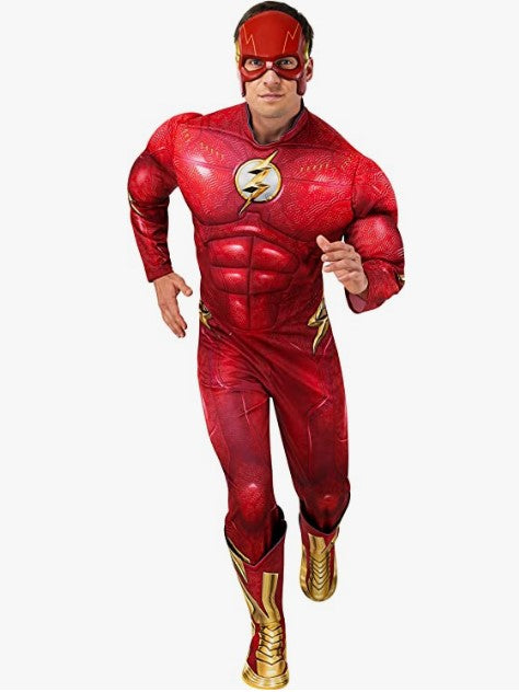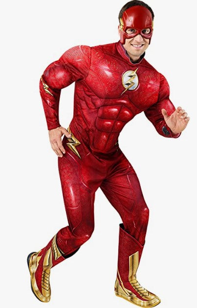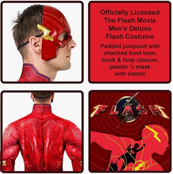 This officially licensed DC Comics Flash Deluxe costume includes a printed costume jumpsuit with padded muscle definition and attached boot-covers as well as the plastic 1/2 mask. Available in adult sizes - Large or XL. Costumes typically run a little smaller than regular clothing sizes. Please purchase accordingly. Other Flash, DC and superhero costumes and accessories are sold separately on our page – subject to availability.
