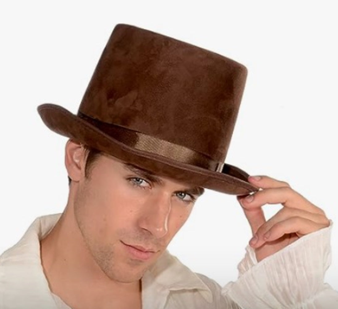 This deluxe brown Top Hat with a suede (polyester) feel is perfect for parties, cosplay, Halloween, Steampunk festivals, theater productions, Willy Wonka and more! Add tulle, flowers, feathers, gears, keys and other embellishments to make it completely your own (not included). Slight color variations in computer monitors, mobile devices and tablets may exist. Other steampunk and Victorian costumes and accessories (glasses, jabot, cuffs, spats, canes, theatrical makeup, gear accessories...) are sold separately on our page – subject to availability. One size fits most up to XL 60 cm.